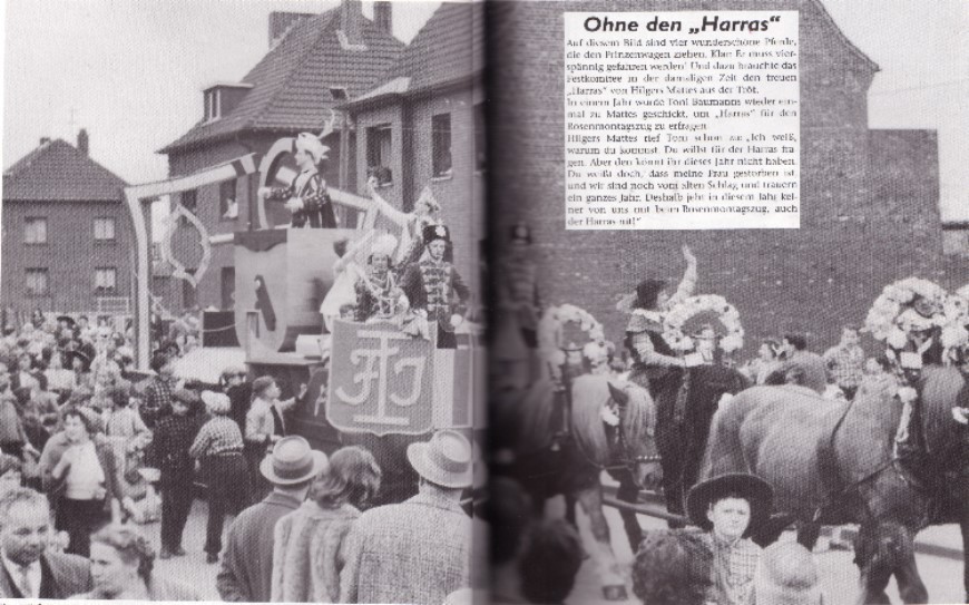 Hilgers Mattes rief Toni schon zu: " Ich weiß warum du kommst. Du willst für der Harras fragen. Aber den könnt ihr dieses Jahr nicht haben.Du weist doch, dass meine Frau gestorben ist, und wir sind noch vom alten Schlag und trauern ein ganzes Jahr. Deshalb jeht in diesem Jahr keiner von uns mit beim Rosenmontagszug, auch der "Harras" nit!"