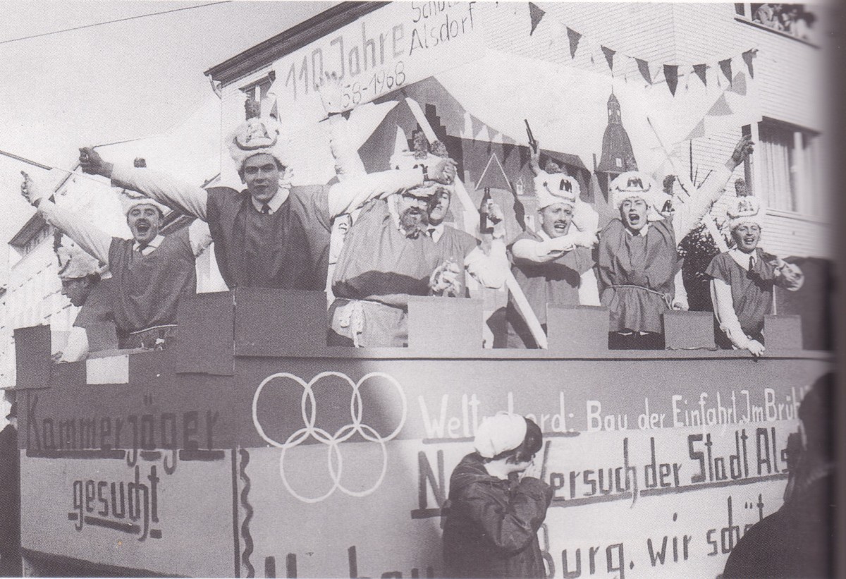 Die 60er Jahre in Motiven des Alsdorfer Rosenmontagszuges:" Kein Freiwild für Alsdorfer Wildgehege" heißt das Motto auf dem Wagen der KG Figaros mit Präsident Leo Miggenaber, den wir auf dem Foto oben sehen.