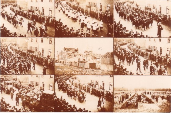 Diese Aufnahme, die von Alsdorf nach Holland geschickt wurde, zeigt die LKws mit den Särgen der Toten des Grubenunglücks von 1930 bei der Ausfahrt aus dem EBV - Gelände neben dem Verwaltungsgebäude in der Bahnhofstraße bei der Beerdigung am 25.10.1930.
